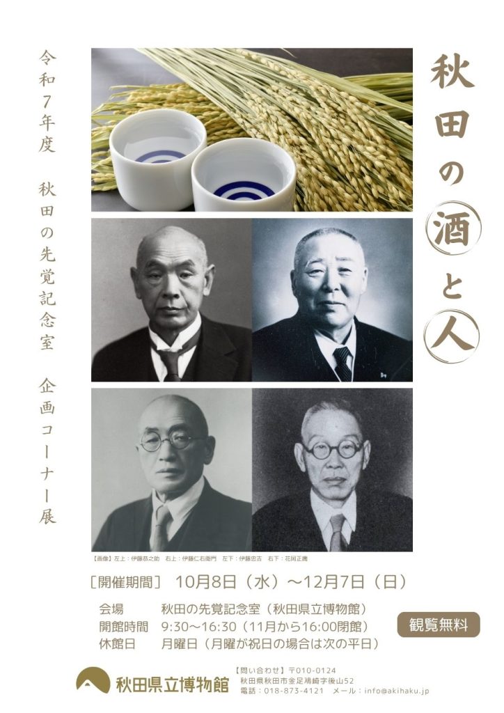 本展では、秋田の酒造りに貢献した伊藤恭之助、伊藤仁右衛門、伊藤忠吉、花岡正庸の果たした役割や秋田の酒作りの歴史を紹介します。